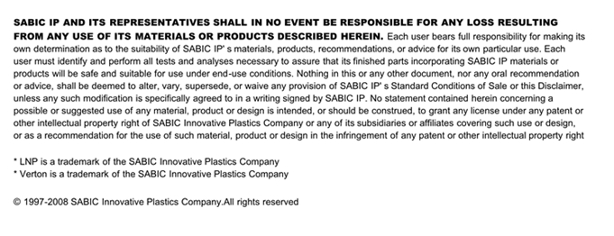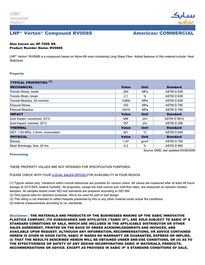 应用范围: 产品描述 LNP Verton RV008S物性表 “LNP VERTON RV008ES是一种聚酰胺66(尼龙66)材料,含有的填充物为长玻璃纤维,加工方式为:注射成型。 LNP VERTON RV008ES的主要特性有: 加工性能良好 热稳定剂” LNP* Verton* RV008S is a compound based on Nylon 66 resin containi