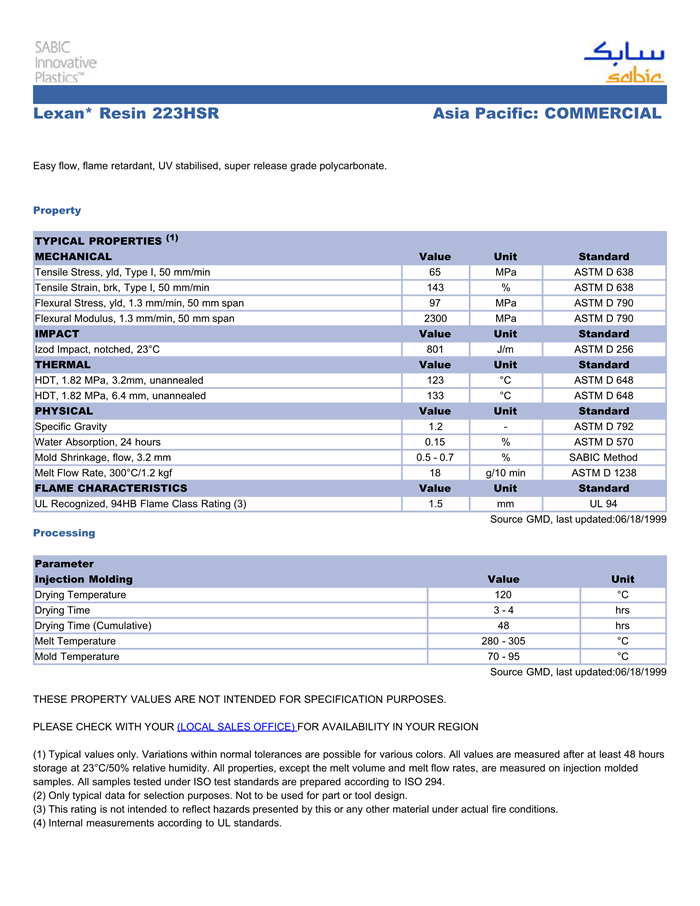 中山LEXAN PC 223HSR物性表