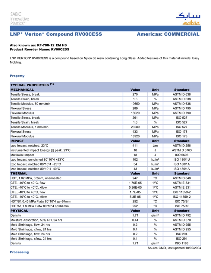 LNP VERTON* RV00CESS is a compound based on Nylon 66 resin containing Long Glass. Added features of this material include: Easy Molding.