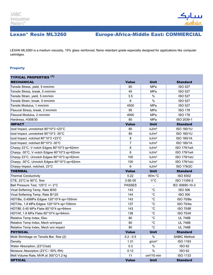 应用范围:产品描述Lexan PC ML3260物性表“Lexan ML3260 resin是一种聚碳酸酯(PC)材料。主要特性为:阻燃/额定火焰。”LEXAN ML3260 is a medium viscosity, 15% glass reinforced, flame retardant grade especially designed for applications like computer