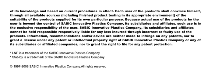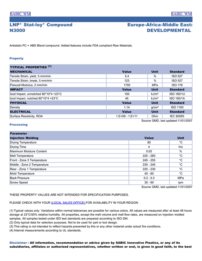 应用范围: 产品描述 LNP STATLOY N3000物性表 Antistatic PC + ABS Blend compound. Added features include FDA compliant Raw Materials.