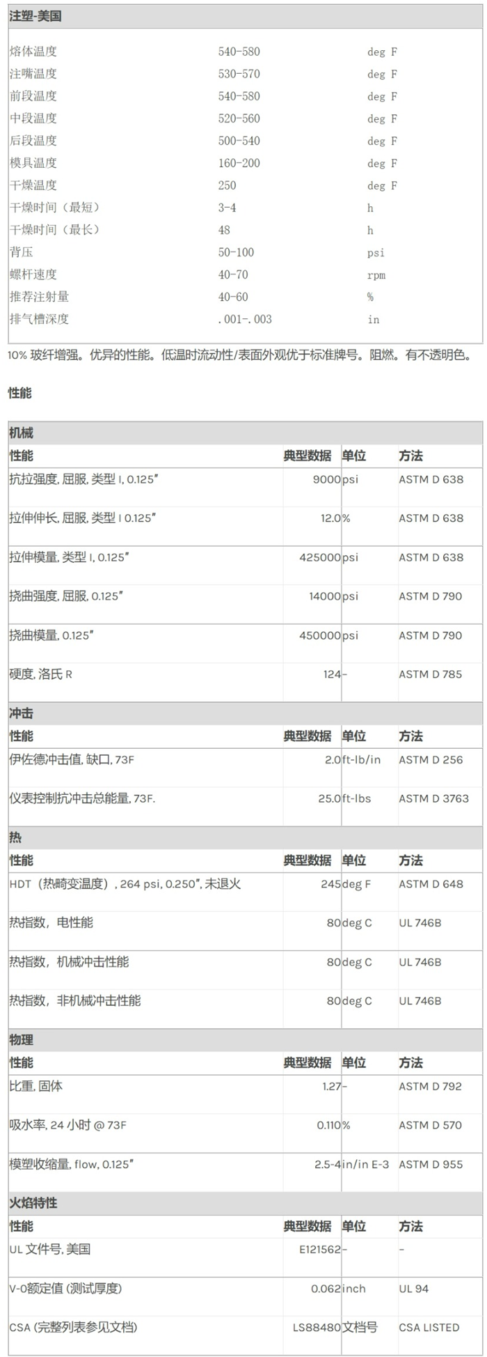 应用范围: 产品描述 Lexan PC SP1252物性表 10% 玻纤增强。优异的性能。低温时流动性/表面外观优于标准牌号。阻燃。有不透明色。 加工