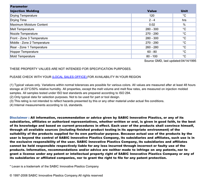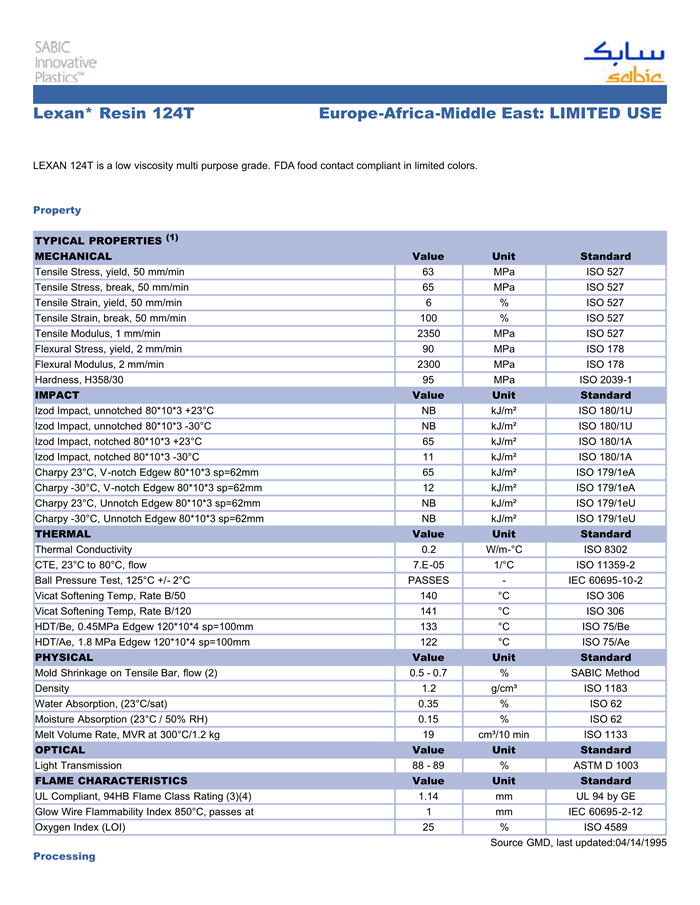 LEXAN 124T is a low viscosity multi purpose grade. FDA food contact compliant in limited colors.
