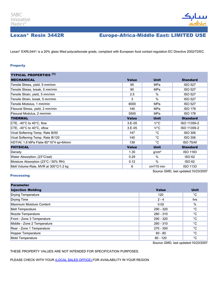 应用范围:产品描述LEXAN PC 3442R物性表Lexan* EXRL0441 is a 20% glass filled polycarbonate grade, compliant with European food contact regulation EC Directive 2002/72/EC.