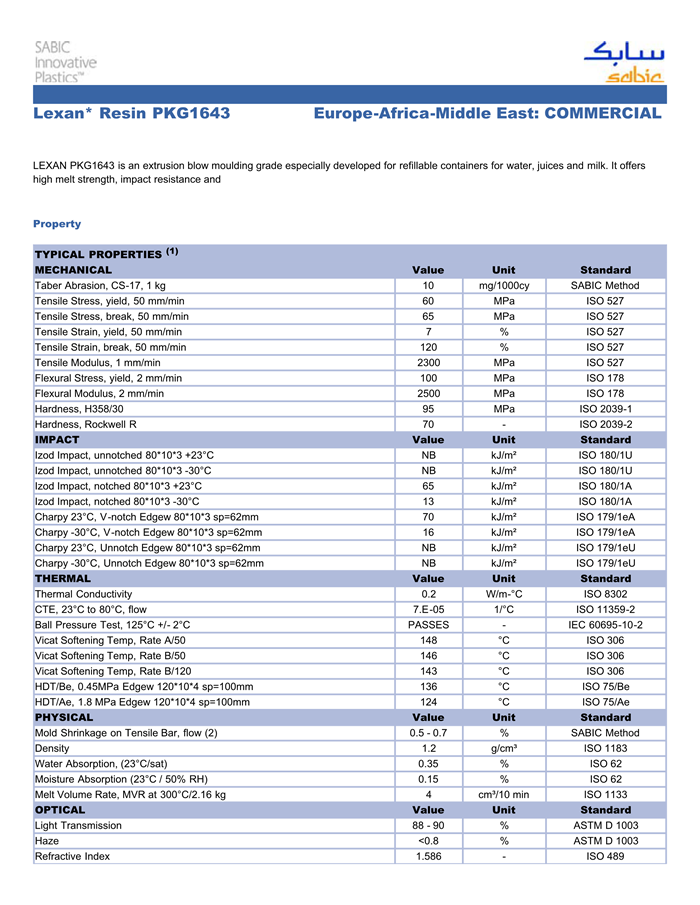 应用范围:产品描述LEXAN PC PKG1643物性表LEXAN PKG1643 is an extrusion blow moulding grade especially developed for refillable containers for water, juices and milk. It offers high melt strength, IMPACT resistance and