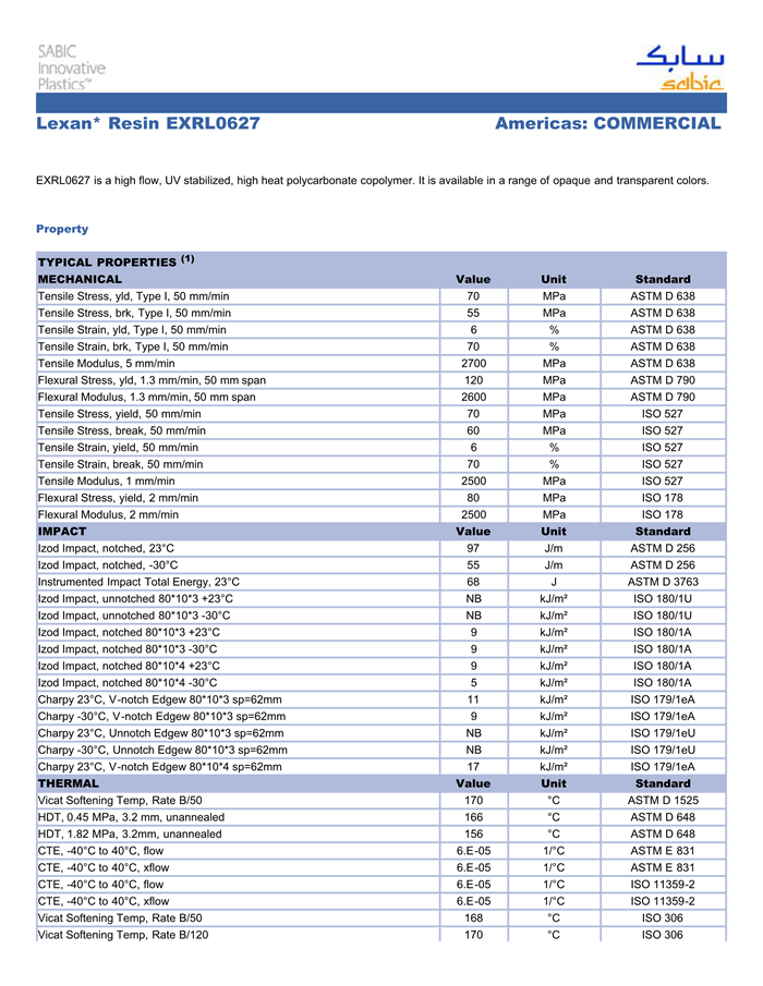 EXRL0627 is a high flow, UV stabilized, high heat polycarbonate copolymer. It is available in a range of opaque and transparent colors.