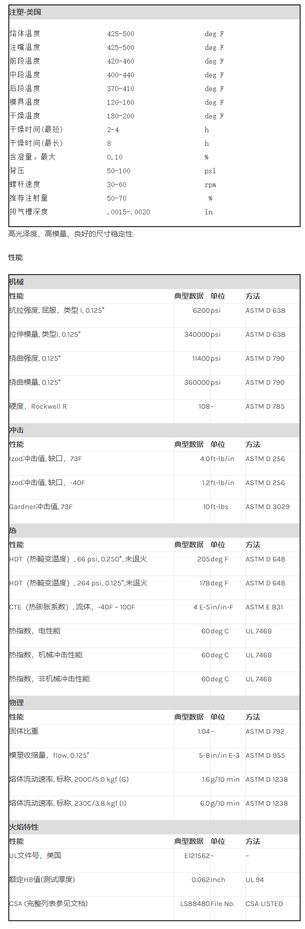 应用范围:产品描述CYCOLAC ABS DFAR物性表高光泽度、高模量、良好的尺寸稳定性.加工