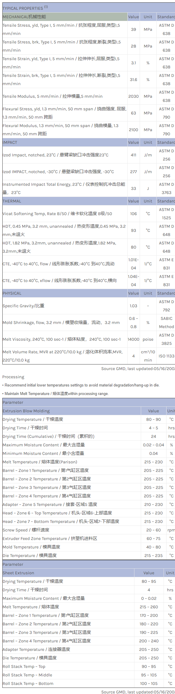 应用范围:产品描述CYCOLAC ABS EXABS01G物性表Sheet extrusion ABS with medium IMPACT.
