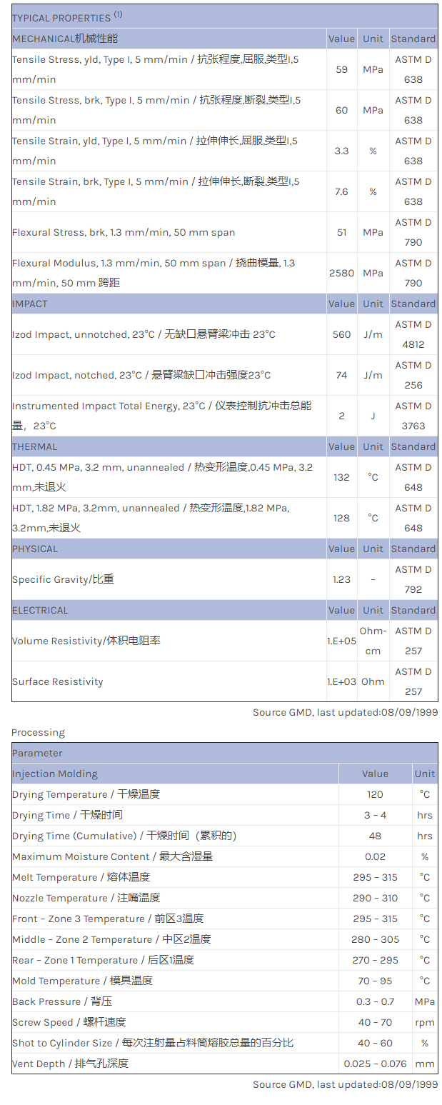 应用范围:产品描述LNP STATKON Lexan_SML5860物性表PRELIMINARY DATA. 4% carbon fiber reinforced PC. Conductive, low ionic, low residual voltage. Will be commercialized as LCG0004.