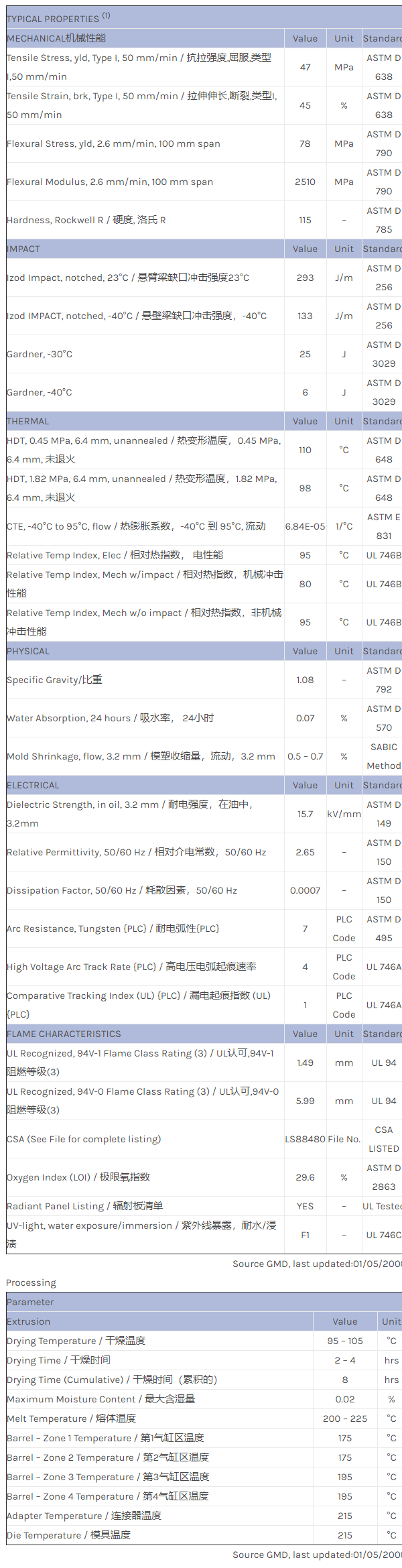 应用范围:产品描述NORYL PPO EN212物性表挤塑级。DTUL(载荷下挠曲温度):212F (100C)。 UL94 V-1额定值。