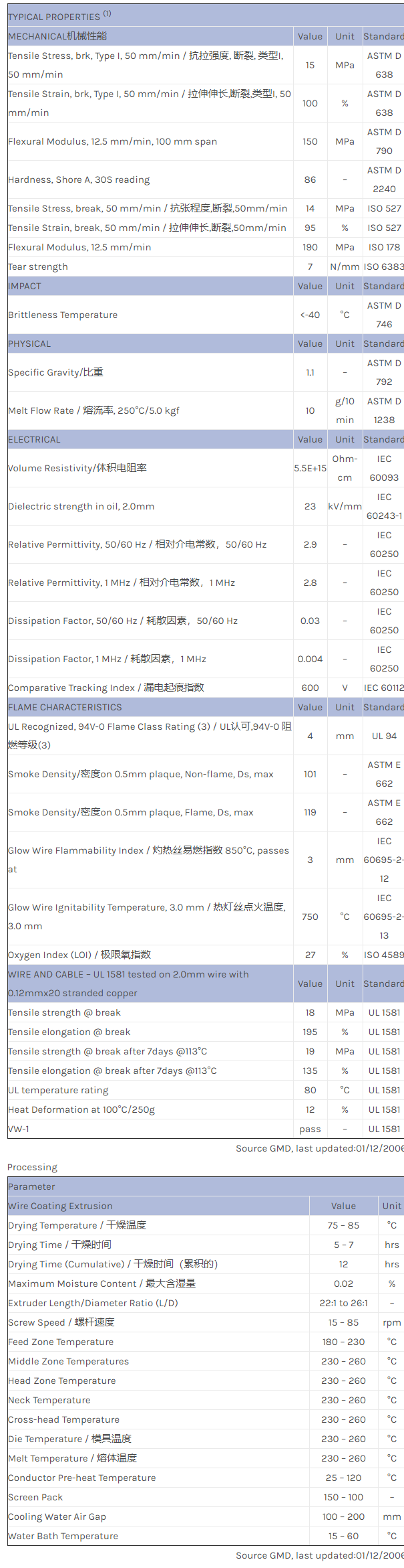 应用范围:产品描述NORYL PPO WCD861A物性表无卤阻燃挤出级,电线绝缘和电缆护套,硬度86.导线绝缘材料或电缆护套.相关色号:WCD861A-RD5B128、WCD861A-VT5E061、WCD861A-WH8B240、WCD861A-OR5C005、WCD861A-YW5C002、WCD861A-BL5E160、WCD861A-GY5B378、WCD861A-BK1066