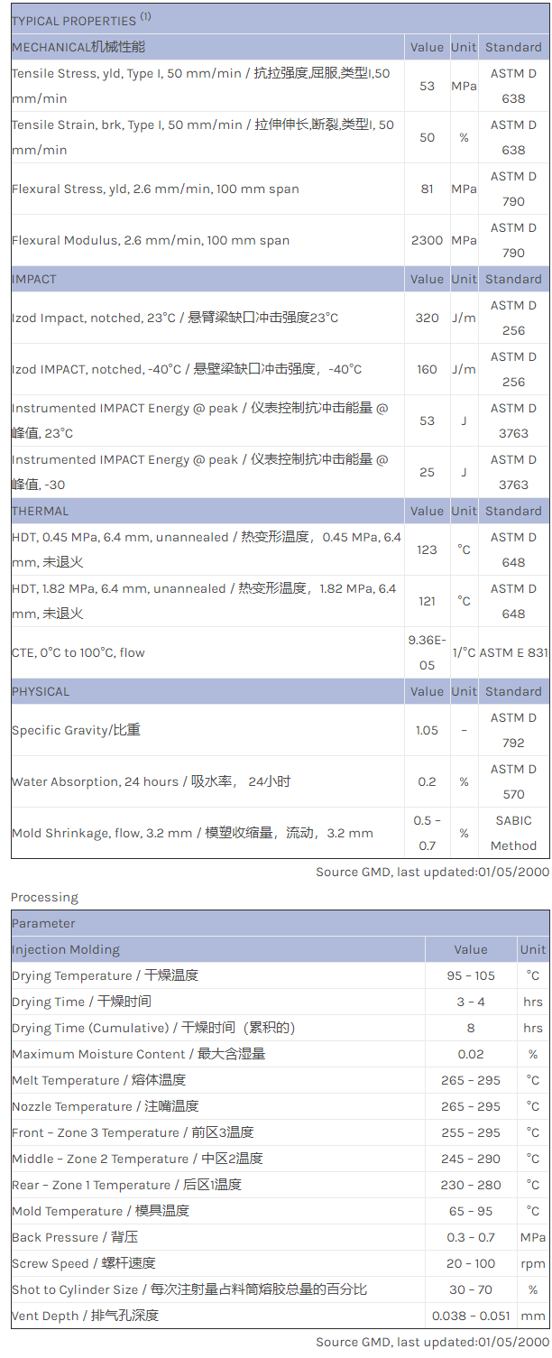 制造汽车内部件。改良的流动性、整体加工经济性。DTUL(载荷挠曲温度):250F。良好的性能稳定性,温度适用范围广