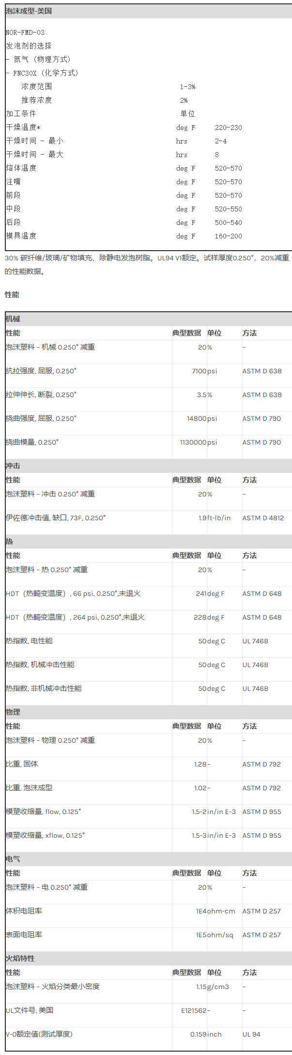 30% 碳纤维/玻璃/矿物填充、除静电发泡树脂。UL94 V1额定。试样厚度0.250″,20%减重的性能数据。