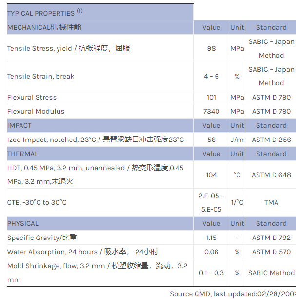 应用范围:产品描述NORYL PPO NC112物性表