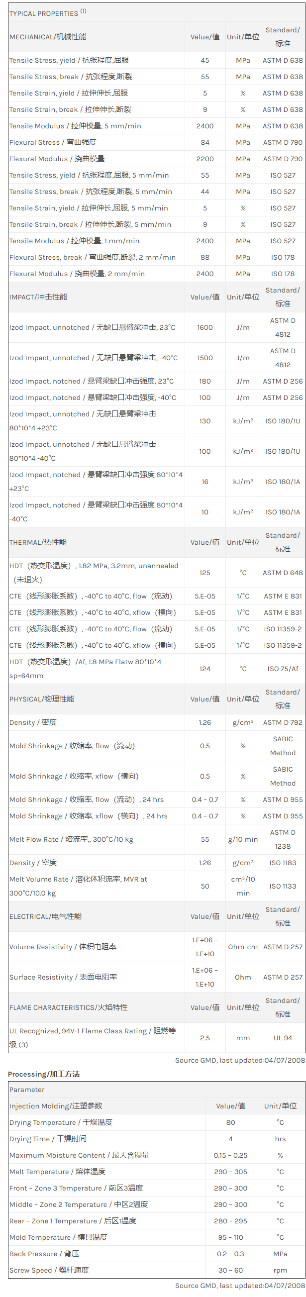 应用范围: 产品描述 LNP Statkon DX07323物性表 “LNP STAT-KON DX07323是一种聚碳酸酯+丙烯腈丁二烯苯乙烯(PC+ABS)材料,含有的填充物为专有填料,加工方式为:注射成型。 LNP STAT-KON DX07323的主要特性有:阻燃/额定火焰” 相关颜色色号:DX07323-BK1D817 LNP* STAT-KON* DX07323 is a compo