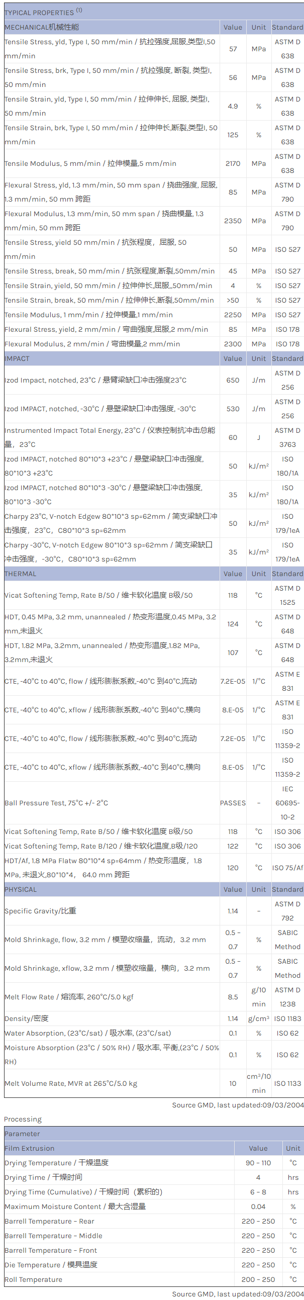 应用范围:产品描述CYCOLOY PC/ABS CE8510物性表Extrusion grade PC/ABS. Low viscosity, high IMPACT and ductility.