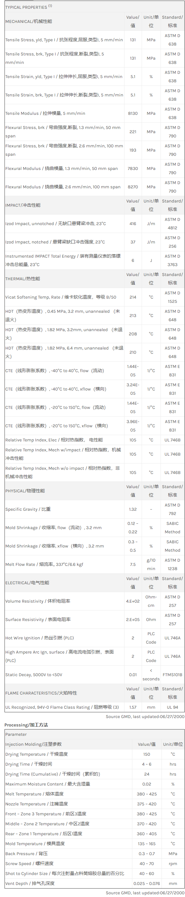 “Ultem UC1200 resin是一种聚酯酰亚胺(PEI)材料,含有的填充物为12% 碳纤维增强材料。 加工方式为:注射成型。