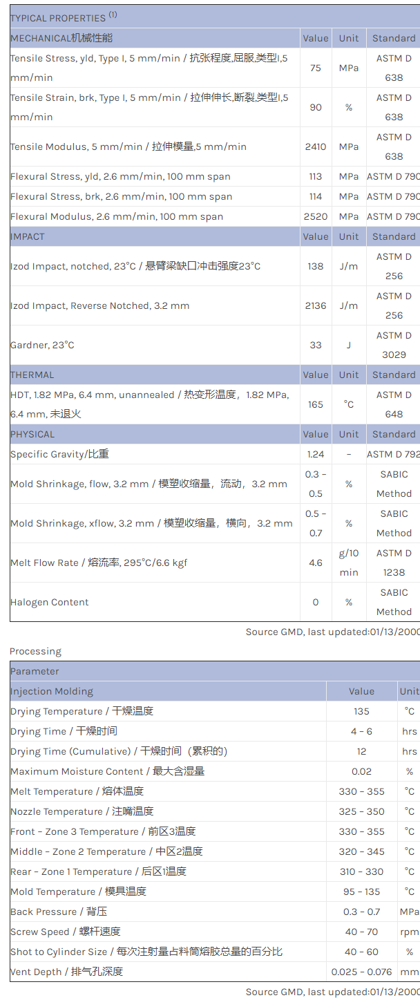 应用范围:产品描述ULTEM PEI MD123物性表General purpose PEI/PPC blend. Nonhalogenated FR.
