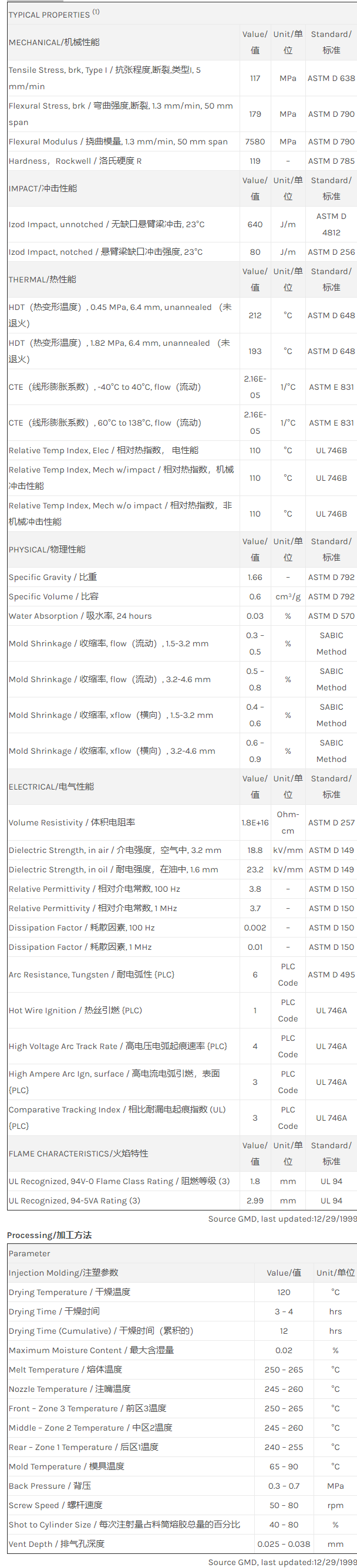 应用范围: 产品描述 Valox PBT 865物性表 30% 玻纤增强 PBTP, UL94 V-0 额定。无表面起膜阻燃。改良的表面外观。与VALOX 855应用范围一致。 相关颜色色号:865-4262、865-1001、865-WH6085 30% GR PBTP, UL94 V-0 rated. Non-blooming flame retardant. Improved surface